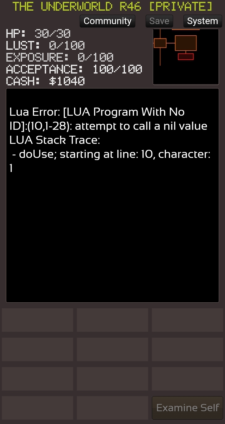 | Description | Whenever I attempt to install and use the Monster Machine mod, I get a screen that reads "Lua Error: [LUA Program With No ID]:(10,1-28): attempt to call a nil value This is after installing the required Male Spider, Kitsune, and Pig King mods. I've tried installing them before the Monster Machine, after, and even tried installing all the monster mods just to be safe. Same results no matter what. There's also no way to back out of the screen short of quitting the session and starting a new one. However, that's probably not too big a deal since you're expected to save before trying any mods in the first place. Let me know if there's something I'm doing wrong, though. | ||||