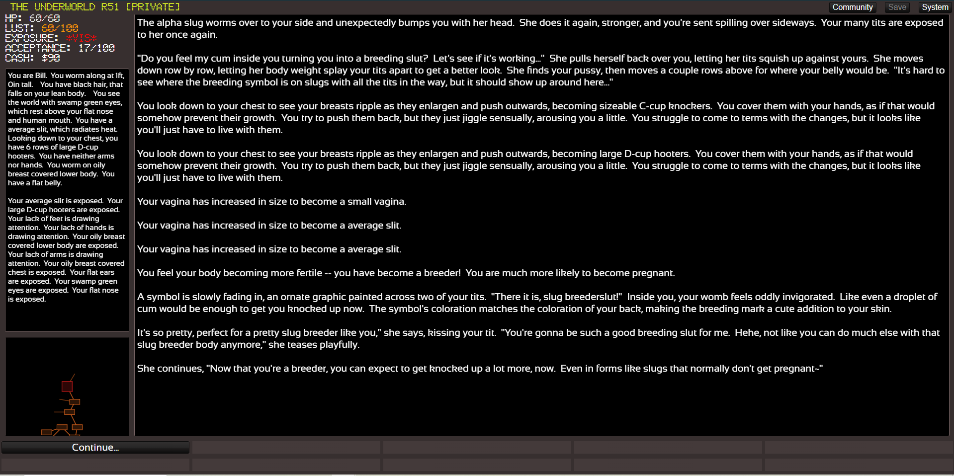 | Description | durring breederfication with alpha slug you try to cover your enlarging breasts with your hands. but you aint suposed to have hands | ||||