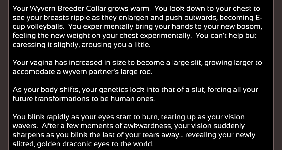 | 2025-07-10 23:05 | SkyCorp | Summary | Pure Wyvern Transformation Doesn't Work If It isn't Preselected => Pure Transformation Mode can sometimes get player locked into pure human species |