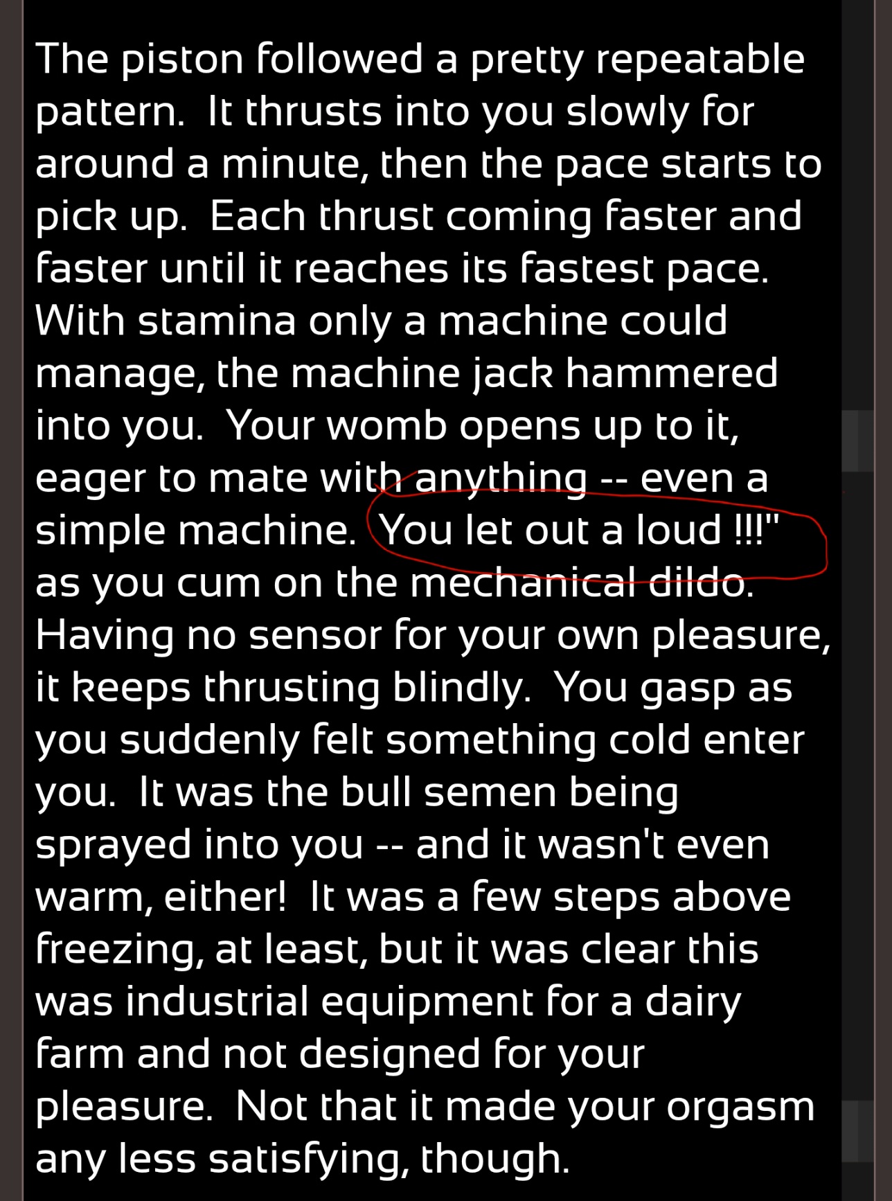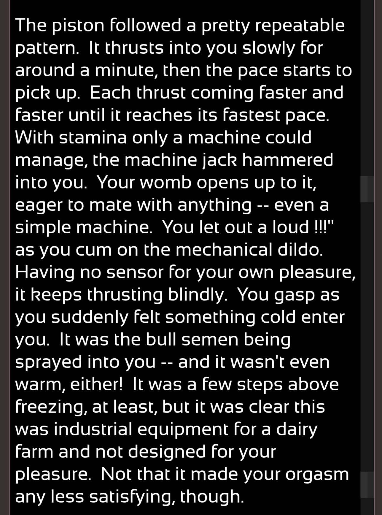 | Description | There seems to be missing speech text where the speech type variable would modify during the artificial insemination scene | ||||