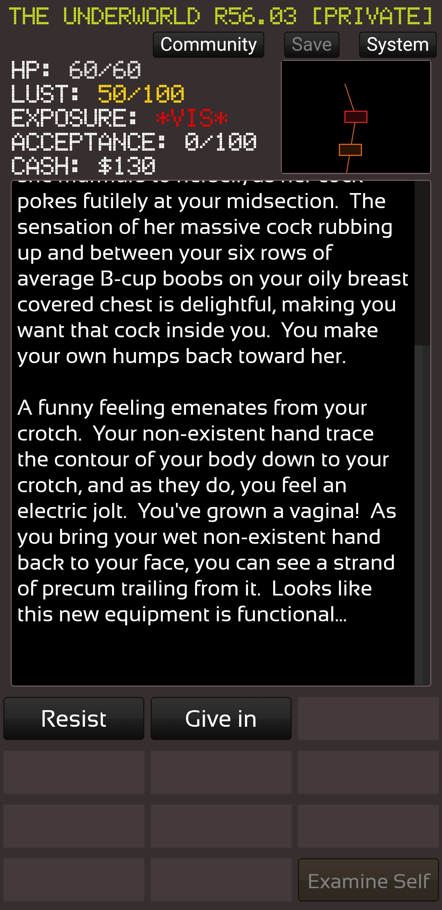 | Steps To Reproduce | For the first one can be reproduced by submitting to an alphaslug and transformed but it can also happen if the player is male when turned into a slug girl and then uses vaginagro to get a vagina. The second one is hard to reproduce outside getting a character to hold you back as a slug girl. | ||||