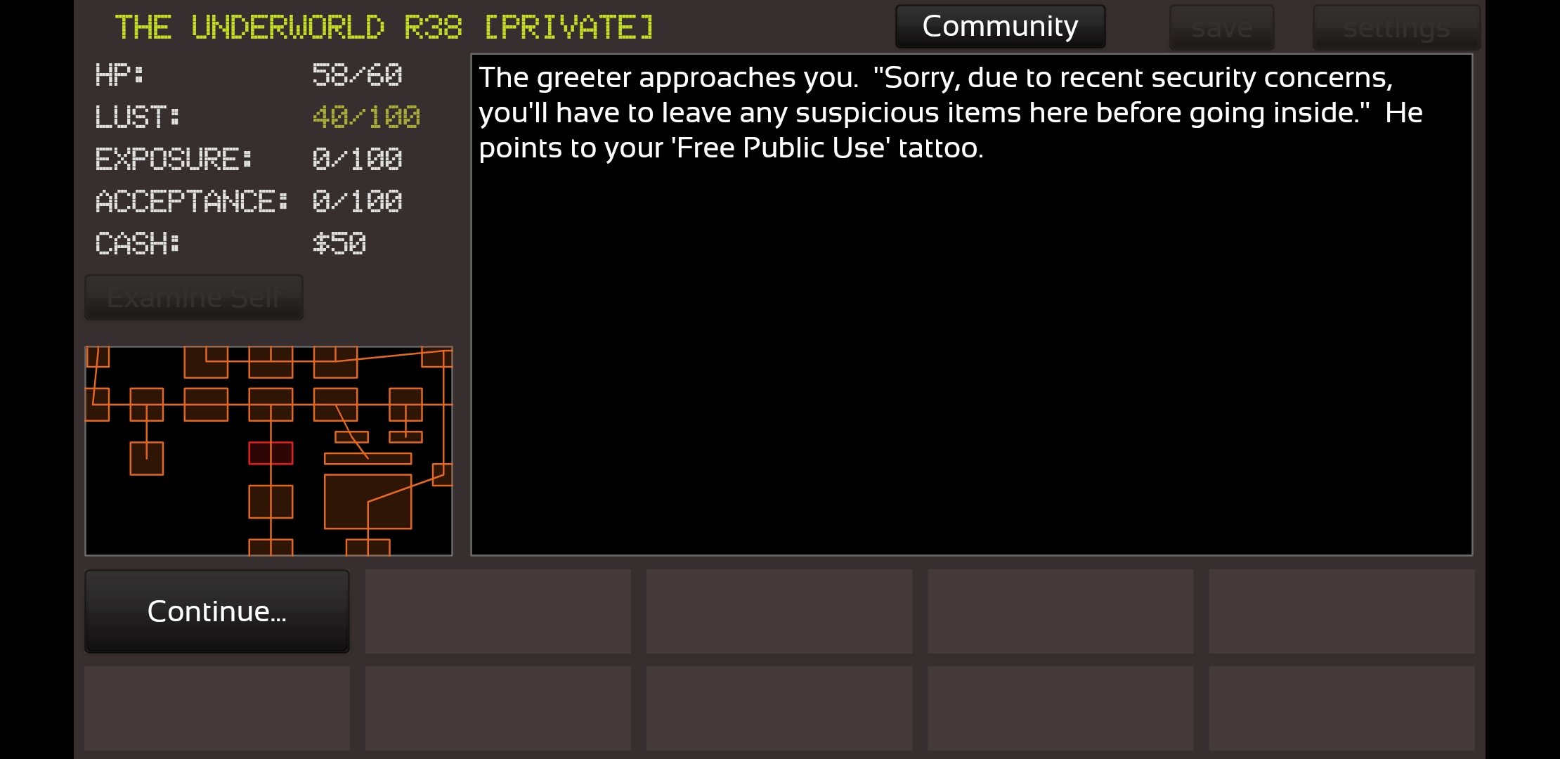 Thought this over and decided to allow them. The next build will allow tattoos and piercings (affects stripclub, aquarium, and Valery). This does open up some cheese potential, and a ton more stuck bad end potential -- however, tattoos and piercings are explicitly warned about bad ends in the store before you can equip them. Plus, getting stuck in the dungeons can sometimes be fun~ |