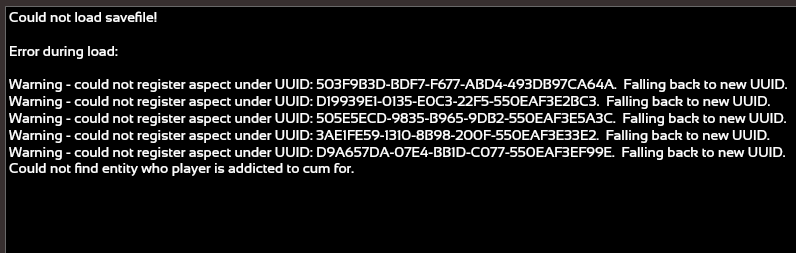 | Description | Upon attempting to load my save that's just after becoming part of the Whoredra, the following text appears as an error: Error during load: Could not find entity who player is addicted to cum for" | ||||
